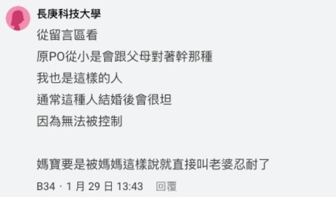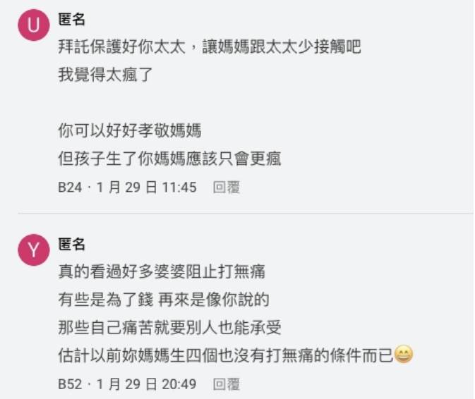 然而,母親十分不開心,開始講大道理,「你們4個孩子我都是難產剖腹來的,打無痛跟催生的後果我比你們清楚!生孩子誰有不痛的?忍一下就過了!」原PO沒有爭辯,僅簡短回覆,「不是妳生而且是我老婆!怎麼決定到時候看醫生評估跟看我老婆承受程度決定! 」母親聽到後,似乎還有些不滿,就撂狠話,「以後有什麼問題不要到時候才來跟我道歉跟後悔!我不會救你們!」