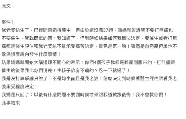 原PO回憶,妻子開兩指待產時,由于還沒滿37週,母親得知後,說「不要打無痛也不要催生!」原PO簡單回說自己知道,但到時結果如何無法決定,要催生或是打無痛,都要由醫師評估,也要看妻子能不能承受痛苦,畢竟是第一胎,沒人能保證會發生什麼事。