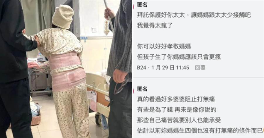 貼文曝光後,一票網友都替原PO的反應拍手叫好,直呼「這老公很棒」、「叫媳婦不能打無痛的人,我都歸納為是全世界最可怕的婆婆,就算不是自己的女兒至少是活生生的人吧?憑什麼要人家忍受痛苦,心理超有病」、「拜託要堅持住啊!因為你媽體力絕對大不如從前,現在的育兒觀念跟以前也不同,真的不要出來荼毒媳婦」、「真的誠摯感謝你有坦住」、「你是一個很棒的先生,還好老婆有你擋著」、「神隊友」。