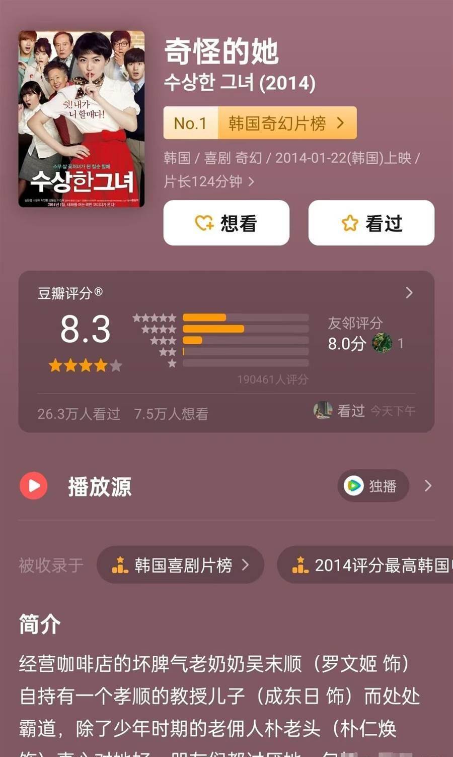 推薦理由:七旬老太變少女,祖孫變情敵笑崩全場返老還童版《重返20歲》!毒舌奶奶突然變回20歲美少女,和孫子當同學,跟單親兒子搞曖昧!KTV唱跳《Let It Go》震碎麥克風,用老年disco舞步征服小鮮肉。最後那句「就算重活一次,我還是會選擇滾燙的人生」讓全場又哭又笑到面膜裂開!