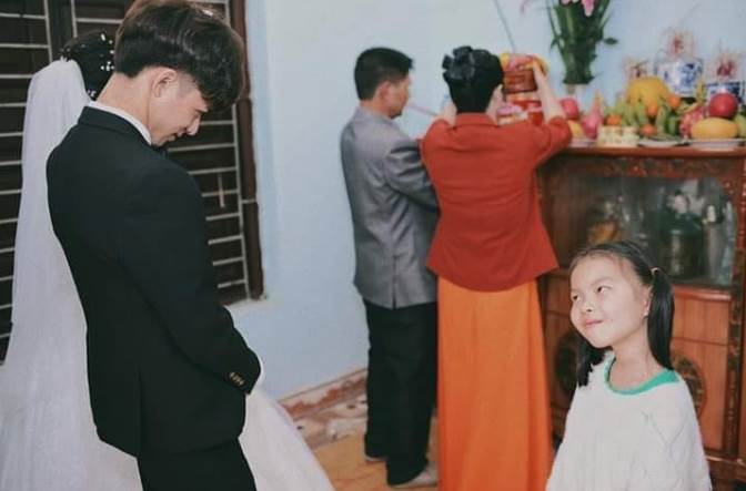 越南有一位可愛的姪女在得知叔叔Chính要跟他女友結婚時,氣到直接趁對方在拜堂時,偷偷斜眼瞪著叔叔,結果被婚禮攝影師看到這難得一見的真實表情,馬上拍下來上傳到網路,殊不知意外讓這個妹妹大爆紅!我們從攝影師Nguyễn Văn Nam貼出的照片中可見,當時新人正在拜堂,一位綁著雙馬尾的小女孩一秒入戲,偷偷斜視看著新郎,而且那個白眼的威力非常強大,嘴巴還呈現出一種抓包的樣子,好像是在跟叔叔說,「不是說好等我長大的嗎!」