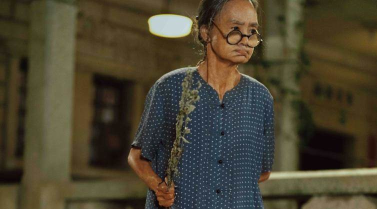 滿頭銀發,臉上布滿皺紋與老年斑,眉毛淡得幾乎看不見,微微下塌的嘴唇努起來時也像沒了牙齒。
