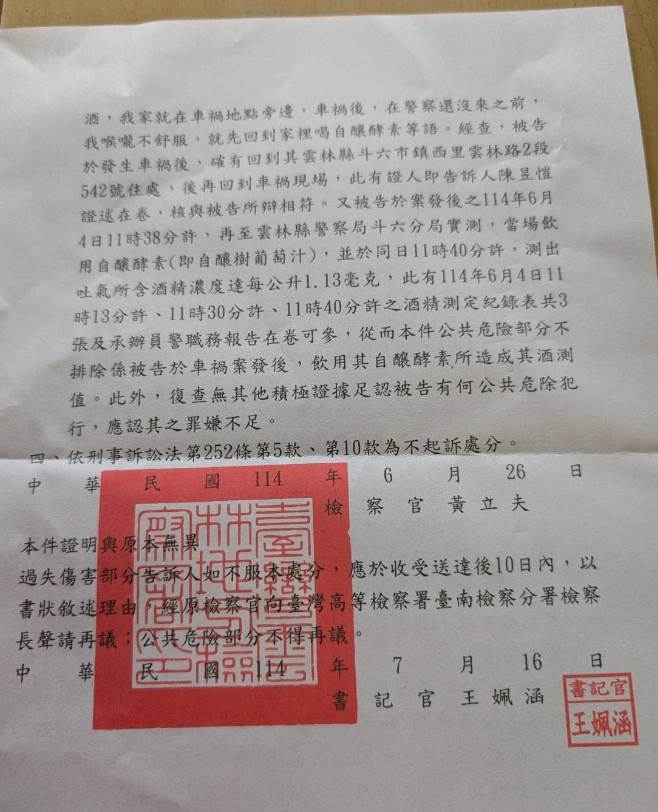 「她一直跟員警反應,但得到的回答卻是『有什麼事去跟檢察官說』。」這句話成了兒子決心討回公道的導火線。他帶著母親的酵素飲品到交通隊實測,結果顯示:喝完30分鐘後檢測,酒精濃度為0;但若是剛喝完3-5分鐘就檢測,濃度竟高達1.13,遠超過法定標準。