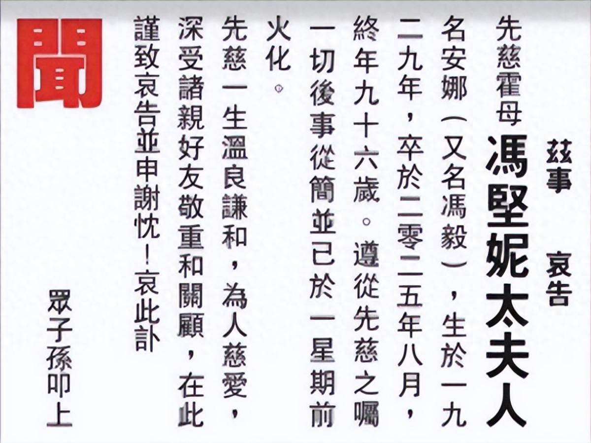 訃告中,「聞」字特意采用了紅色,這是傳統習俗中對96歲高齡逝者「喜喪」的標注,訃告還披露了她的另一個名字「馮毅」,以及生于1929年的信息。