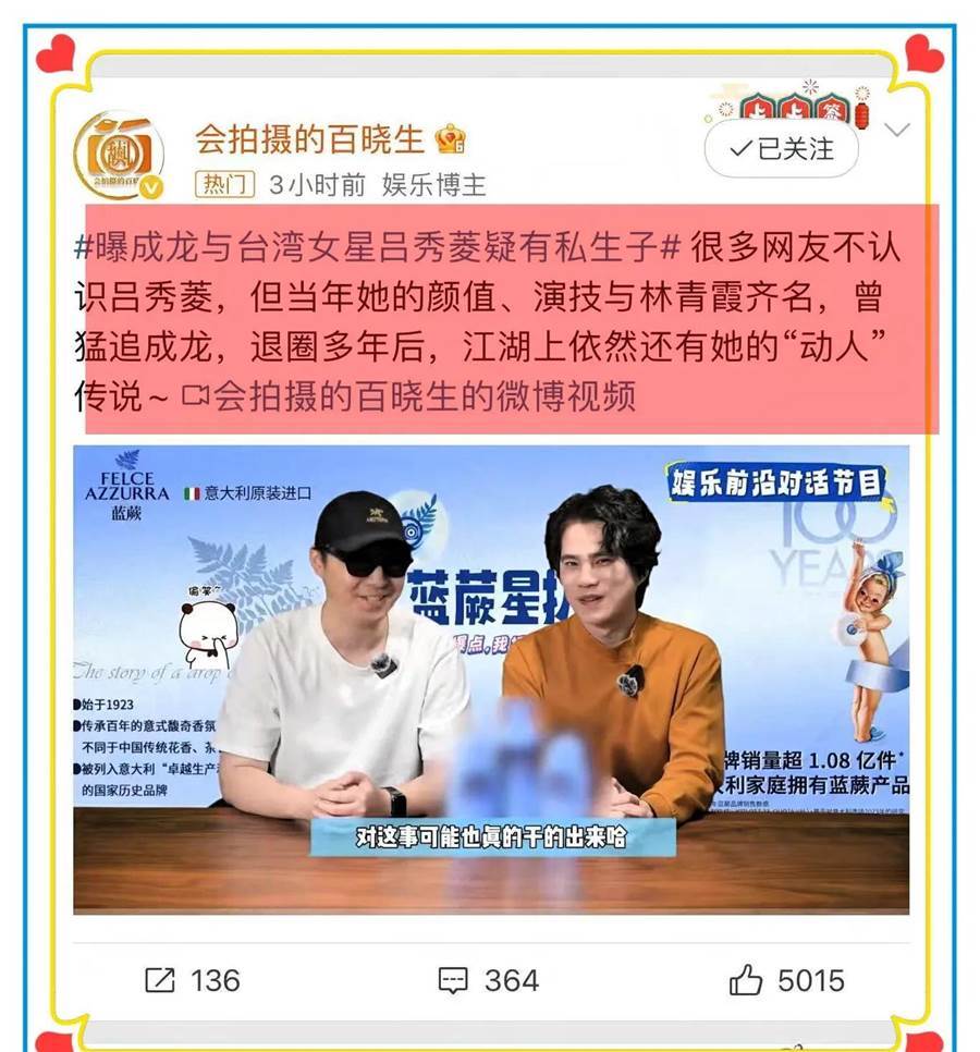 剛剛狗仔在直播的時候講到:有一個知情人稱呂秀菱的兒子是成龍大哥的!