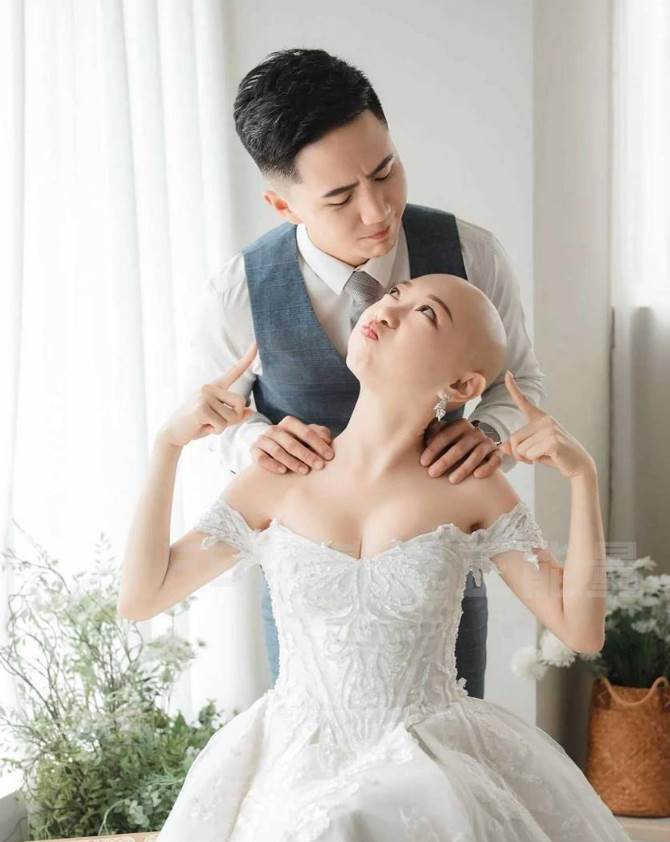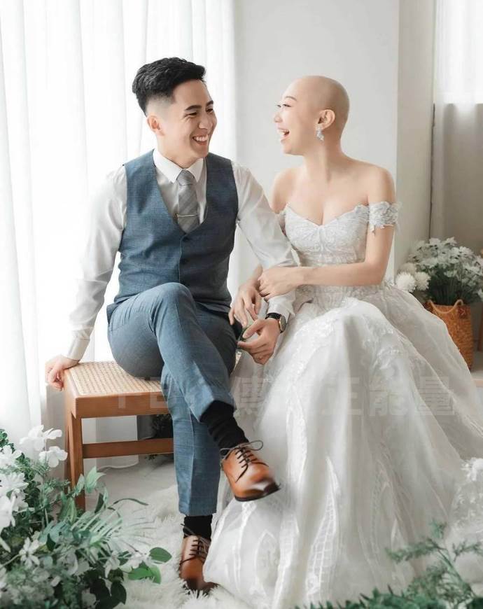 更令人動容的是,他們決定繼續完成婚禮,新娘特別要求拍攝一組光頭婚紗照。她在婚紗店對攝影師說:「可不可以幫我拍幾組光頭婚紗?不是紀念而是紀錄,我想紀錄此刻的自己,我!很勇敢過!」這組照片在網路流傳後,引發熱烈迴響。
