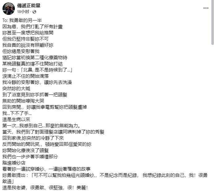 這對原本準備步入禮堂的情侶,在婚前健康檢查時發現女方罹患晚期卵巢癌,所有婚禮計劃被迫中止。男方在貼文中寫道:「她曾經想推開我,怕耽誤我的人生,但我堅持非她不娶。」化療過程中,女友的頭髮開始大量脫落,某天晚上她看著浴室排水孔堆積的髮絲,顫抖著問:「北鼻,是不是時候到了...」
