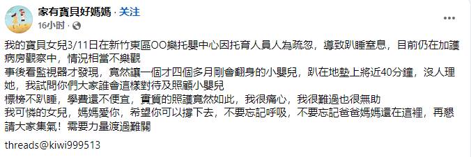近日,網路一則貼文引發全台家長怒火。一名媽媽心痛控訴,她年僅4個多月大的女兒,在新竹東區某知名托嬰中心,因托育人員的疏忽,竟被放任趴睡在地墊上長達40分鐘,等到被發現時已失去呼吸心跳,目前仍在加護病房與死神搏鬥。媽媽淚訴:「標榜不趴睡,學費還不便宜,實際照顧卻如此草率!」