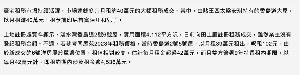 何鴻燊四房太太梁安琪名下的房產多不勝數,不只是有普通的住宅房產,更有大量的獨立屋(洋房),這些不動產的市值在250億以上。梁安琪持有那麼多的房產,有大部分是用來收租用,而能夠租得起她名下的房產,尤其是獨立屋的,大多都非富即貴。梁安琪名下位于南區香島道2號的一棟洋房租了出去,租這套洋房的人來頭也不小,是印尼前首富陳江和的兒子陳建升,他一口氣租了這套洋房九年,租金逾4500萬。