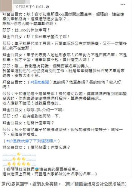 原PO聽完表明替她介紹一個優質好男人,而且符合好友的需求「開百萬名車」,常開車穿梭大街小巷,而且外貌偏上、收入不錯及有長輩緣,深受婆婆媽媽喜愛。她不斷鼓吹,讓好友語氣雀躍哀求介紹並詢問「那對方開什麼車?」她一看拜金女上鉤立刻回傳一張照片,瞬間逼得好友氣炸「妳耍我啊?」