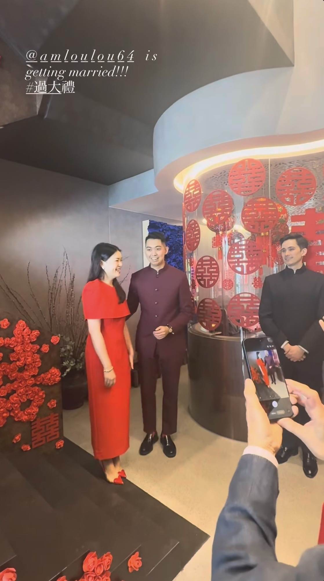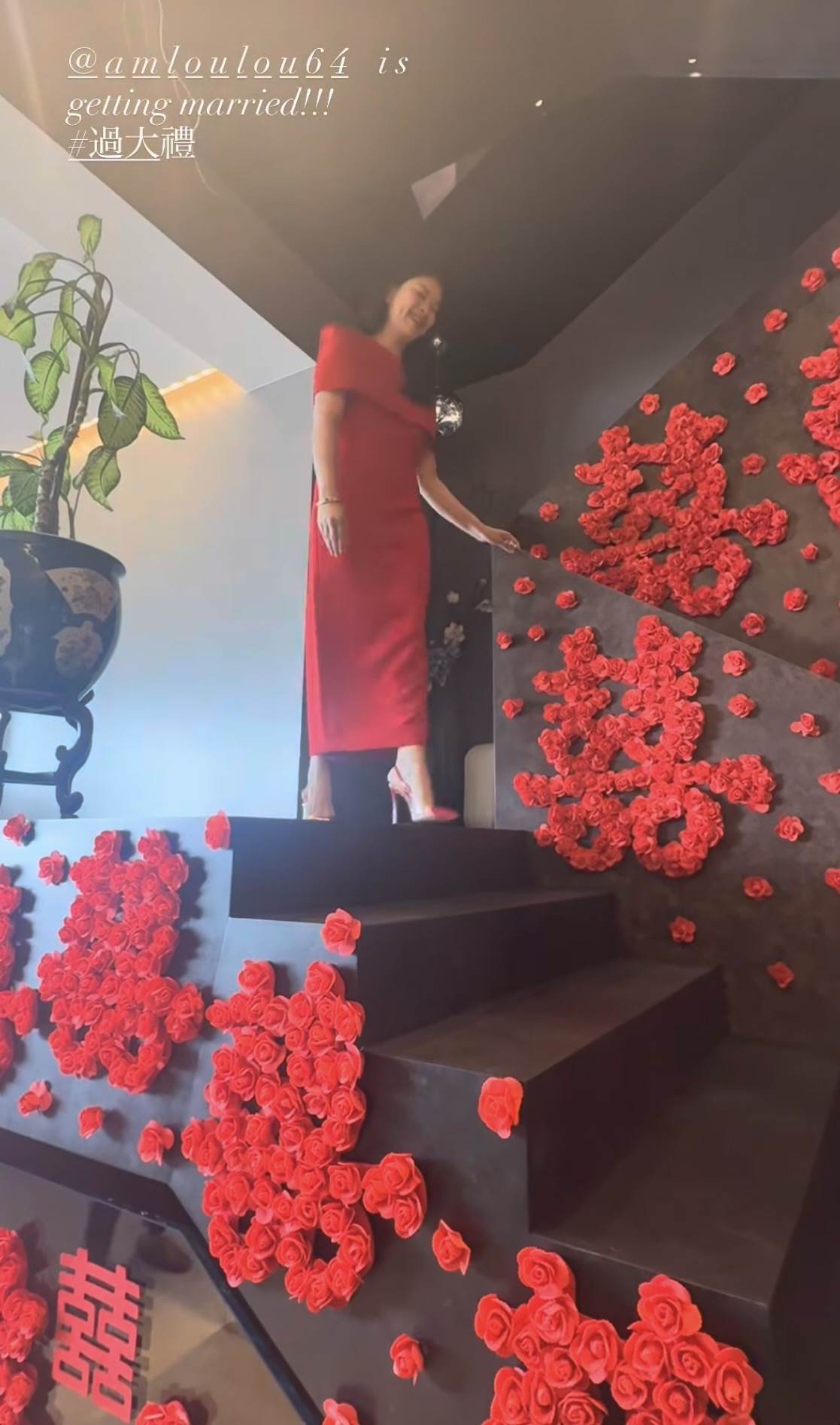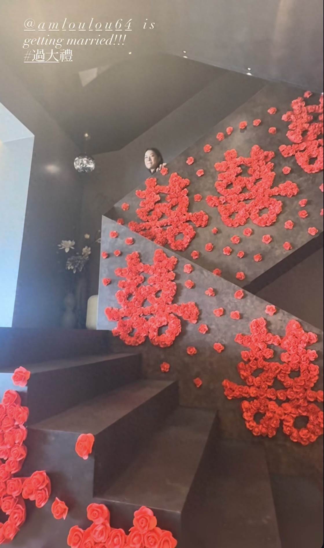 雷正殷屬于兩個大家族的后人,她的母親是利希慎家族的后人,父親是九龍巴士創辦人雷瑞德的孫子,而大戶人家的婚慶向來都辦得有板有眼,何況其父母都是社交名人,所以即便是過大禮儀式也不會怠慢。從被曝光的照片來看,在雷正殷娘家的大宅內,幾乎是肉眼可見的地方都貼上了囍字,尤其是樓梯處——因為樓梯是黑色的,所以全部以紅色的玫瑰拼成囍字。而在樓梯正對的裝飾架子上的玻璃,也都是各式各樣的囍字。總之整個大宅的各個角落,不是紅色的玫瑰,就是紅色的囍字。