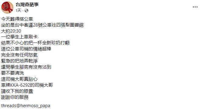 事發在晚上8點30分左右,一名學生在四張犁圖書館站上車時,不慎將全新珍珠奶茶打翻在公車地板上。正當眾人以為會迎來一頓責罵時,車牌KKA-6292的司機大哥卻展現超乎常人的耐心,不僅沒有絲毫怒氣,還立即協助清理,更關心詢問學生腳底是否沾到需要清洗。這暖心一幕讓在場乘客感動不已,直呼「請收下我的膝蓋」。