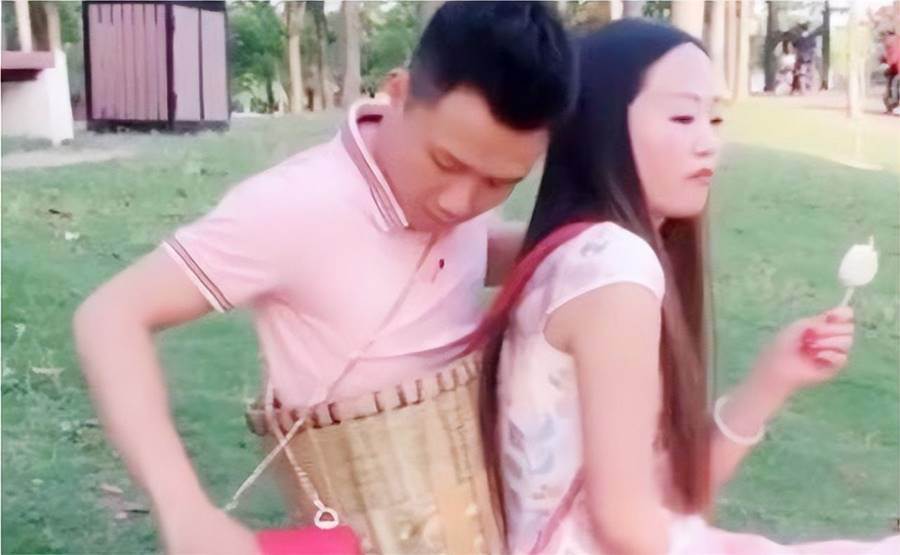 同樣伸手殘障痛苦的兩個人,生活卻能夠相輔相成,丈夫沒有腿,妻子阿嬌就會將丈夫放在背簍里,背在身上,外出采買他們所需要的生活用品。