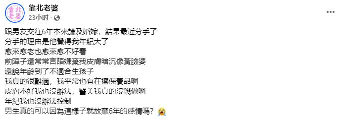原PO在貼文中心痛寫道,6年感情敵不過一句「你年紀大了」。前男友最近經常嫌棄她皮膚暗沉像黃臉婆,還說年齡不適合生孩子,最後以「外表老化」為由結束這段感情。最讓她難以接受的是,分手後從共同朋友那裡得知,前男友早在半年前就開始參加相親活動,對方還是透過婚友社介紹的年輕女性。