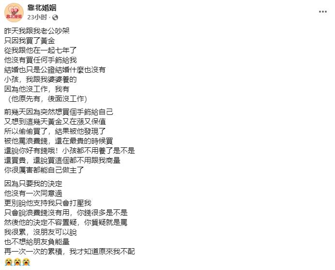 原PO心酸描述七年婚姻中,丈夫從未送過任何首飾,連結婚都只是簡單公證。身為家中經濟支柱的她,前幾天因黃金漲價且具保值功能,悄悄買了件金飾犒賞自己,卻被丈夫痛罵「浪費錢」、「小孩都不用養了」。最讓她崩潰的是,丈夫長期打壓她的決定,還不容許她質疑他的選擇,讓她自嘲「原來我不配」。