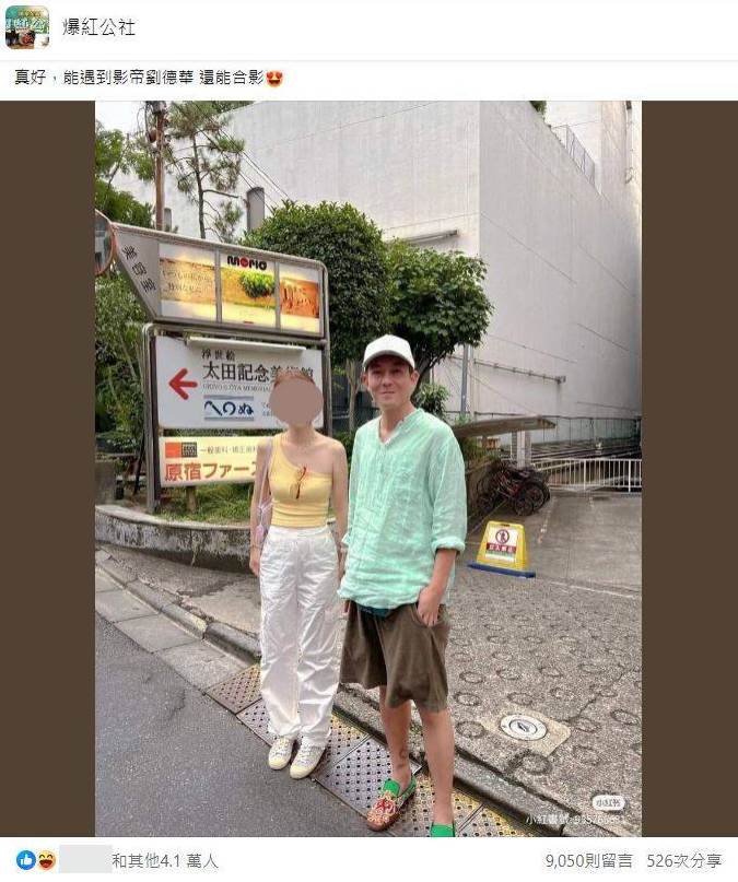 一位網友在臉書社團《爆紅公社》轉貼兩人合照羨慕:「真好,能遇到影帝劉德華,還能合影」,原PO還在句尾加上一個眼冒愛心的表情符號表達喜愛。圖中女粉絲和男明星對著鏡頭開心微笑,從街景可以推測地點在日本東京,不過女粉絲捕獲的不是華仔,而是冠希啊!