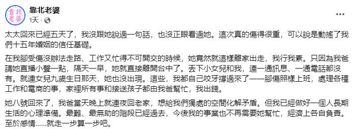 這位鄰居更補充,妻子平時除了直播工作,還要負責全家三餐和接送孩子,經常看到她忙到晚上十點多才能吃晚餐。而丈夫所謂的「腳傷期間」,其實妻子前一周才剛帶他去醫院回診,連復健時間都是妻子特別請假配合的。