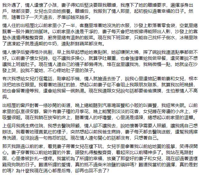 這名男子在社群平台發文,詳細描述自己為了一段婚外情,放棄了原本美滿的家庭。他離開永遠乾淨整潔的家,搬進堆滿未洗衣物的出租屋;告體貼溫柔的妻子,與情緒反覆無常的情人同居。原本以為是真愛讓他義無反顧,卻在情人懷孕後,生活徹底失控。