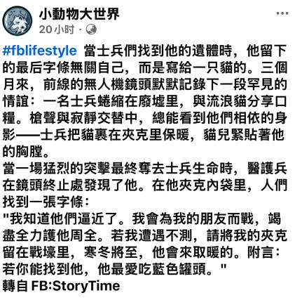 近日網路一則「士兵為護貓留下最後遺言」的真實故事讓無數網友淚崩。在戰火紛飛的前線,一名士兵與流浪貓建立深厚情誼,最終在犧牲前留下字條,懇求戰友將他的夾克留給貓咪取暖,字條末還細心註明「他最愛吃藍色罐頭」。這段跨越物種的情誼,引發全民對戰火中動物的關注。