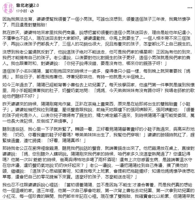 近日網路一則溫馨故事引發熱議,一對因不孕領養男孩的夫妻,在養子到來三年後竟奇蹟懷上雙胞胎。正當全家沉浸在喜悅中時,婆婆卻提出將領養的孫子送回的建議,引發一場關于親情與血緣的深刻對話,結局讓上萬網友感動落淚。