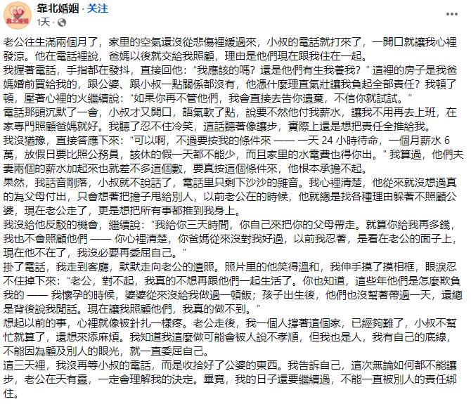 近日網路一則貼文掀起熱議,一名丈夫剛過世兩個月的女子,接到小叔來電要求她獨自照顧公婆,正當所有人以為這又是常見的家庭糾紛時,故事卻出現驚人轉折。這名媳婦不僅開出月薪6萬、24小時待命的條件,更在文末揭露一個讓所有人錯愕的真相:「原來我們都誤會小叔了...」