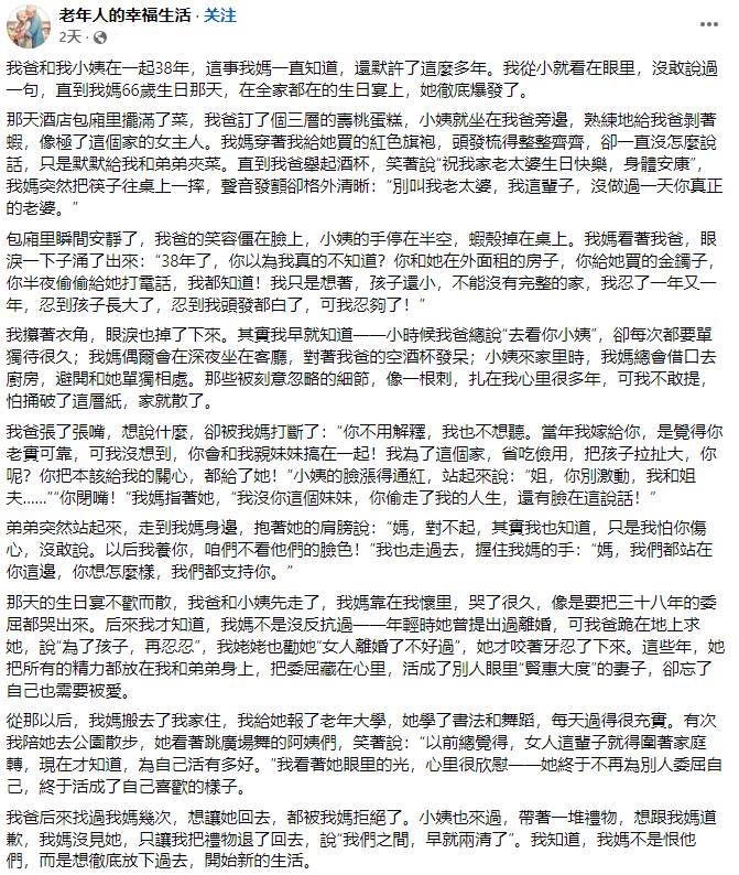 事發當天,壽星穿著兒子買的紅色旗袍,看著丈夫與親妹妹並肩而坐的親密模樣,終于在丈夫舉杯祝壽時徹底爆發。「別叫我老太婆,我這輩子,沒做過一天你真正的老婆!」這句話像驚雷般震撼全場。她顫抖著揭露38年來的委屈:「你們在外面租的房子、你給她買的金鐲子、半夜偷偷打電話,我都知道!」