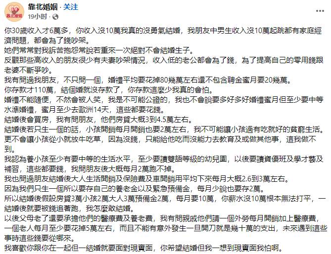 近日網路一則「月薪沒10萬不敢結婚」的貼文引發熱議,女方列出婚禮、房貸、育兒等開銷,直言男方30歲收入6萬多、存款110萬根本不夠結婚。這起感情糾紛最近出現神展開,沉默3天的男主角竟用一份完整的財務試算表做出回應,專業程度讓網友全看傻。