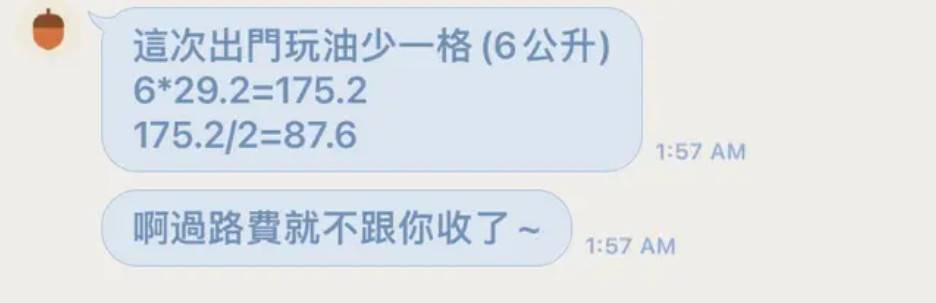 交往後前男友也買了車,兩人出遊原PO也有請飲料或吃飯,但前男友就然連油錶少一格(6公升),仍然叫原PO平分油錢175.2元,訊息上還大方表示不收過路費,本來玩得很開心,看到後瞬間都涼了,但也是無奈付了錢~
