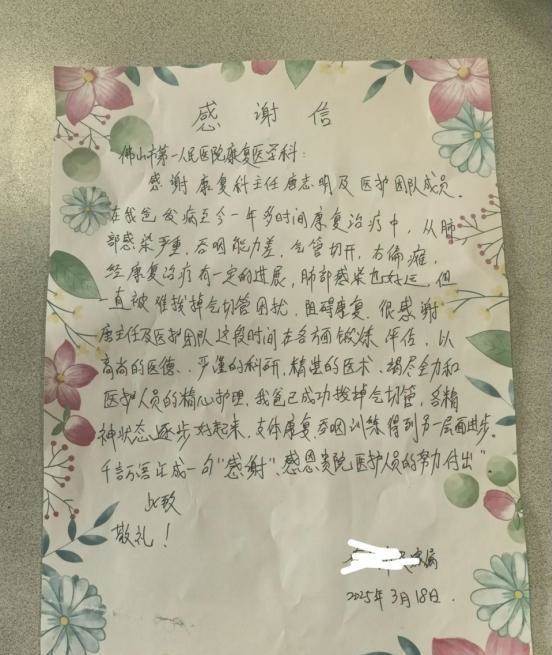 2025年,患者家屬經人推薦,來到佛山市第一人民醫院。該院康復醫學科主任唐志明接診後認為,患者氣道條件並非不可逆,系統康復有望拔管。隨後,唐志明迅速組織團隊展開討論,針對患者「分泌物多-呼吸肌無力-吞嚥障礙-吸入性肺炎」惡性循環,制定個性化方案。
