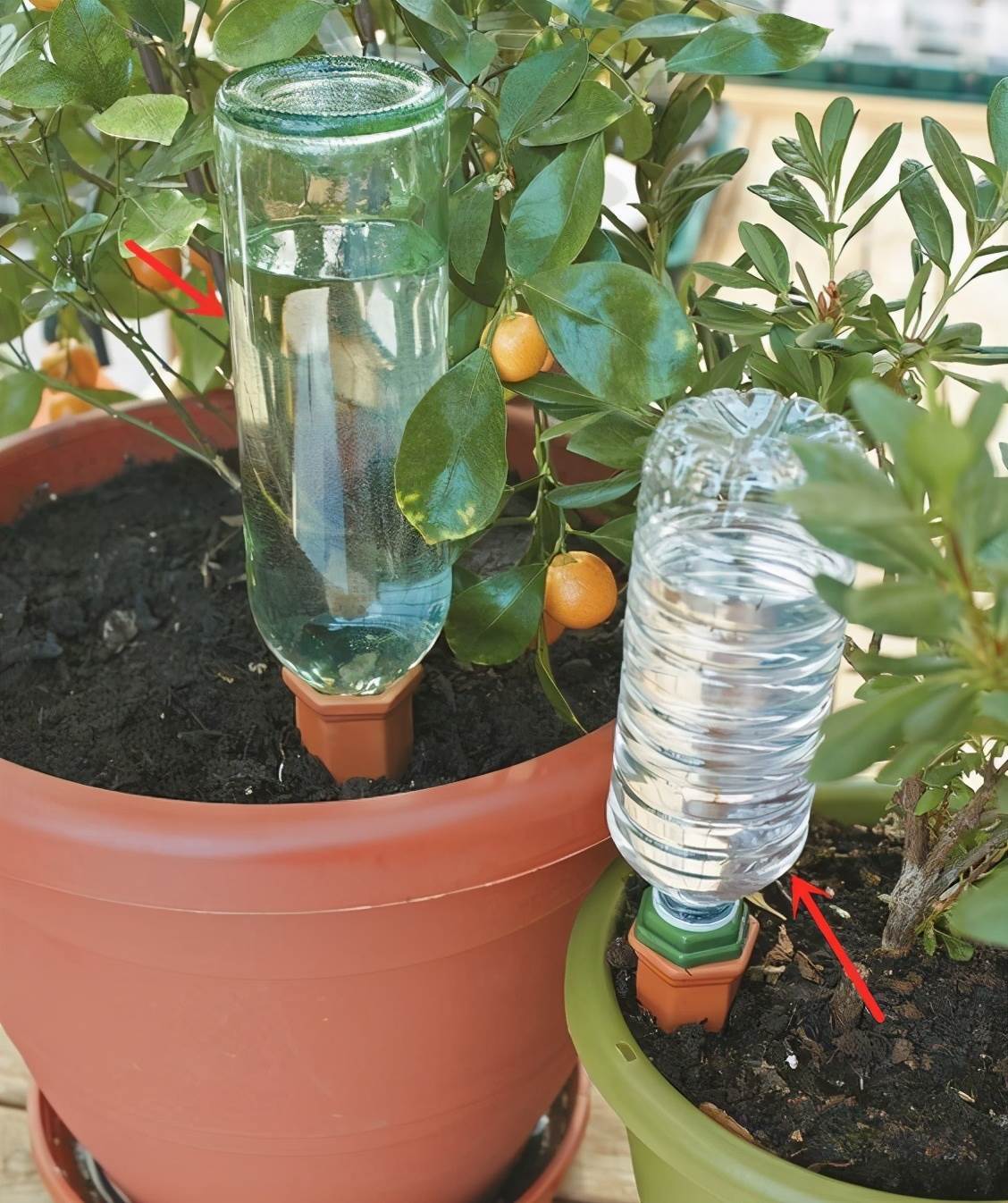 最簡單的做法就是在瓶蓋上戳幾個小洞,裡面裝滿水直接插在花盆一側,方便水緩慢深入根部,平時一段時間忘了澆水,也能保證綠植等好好生長。