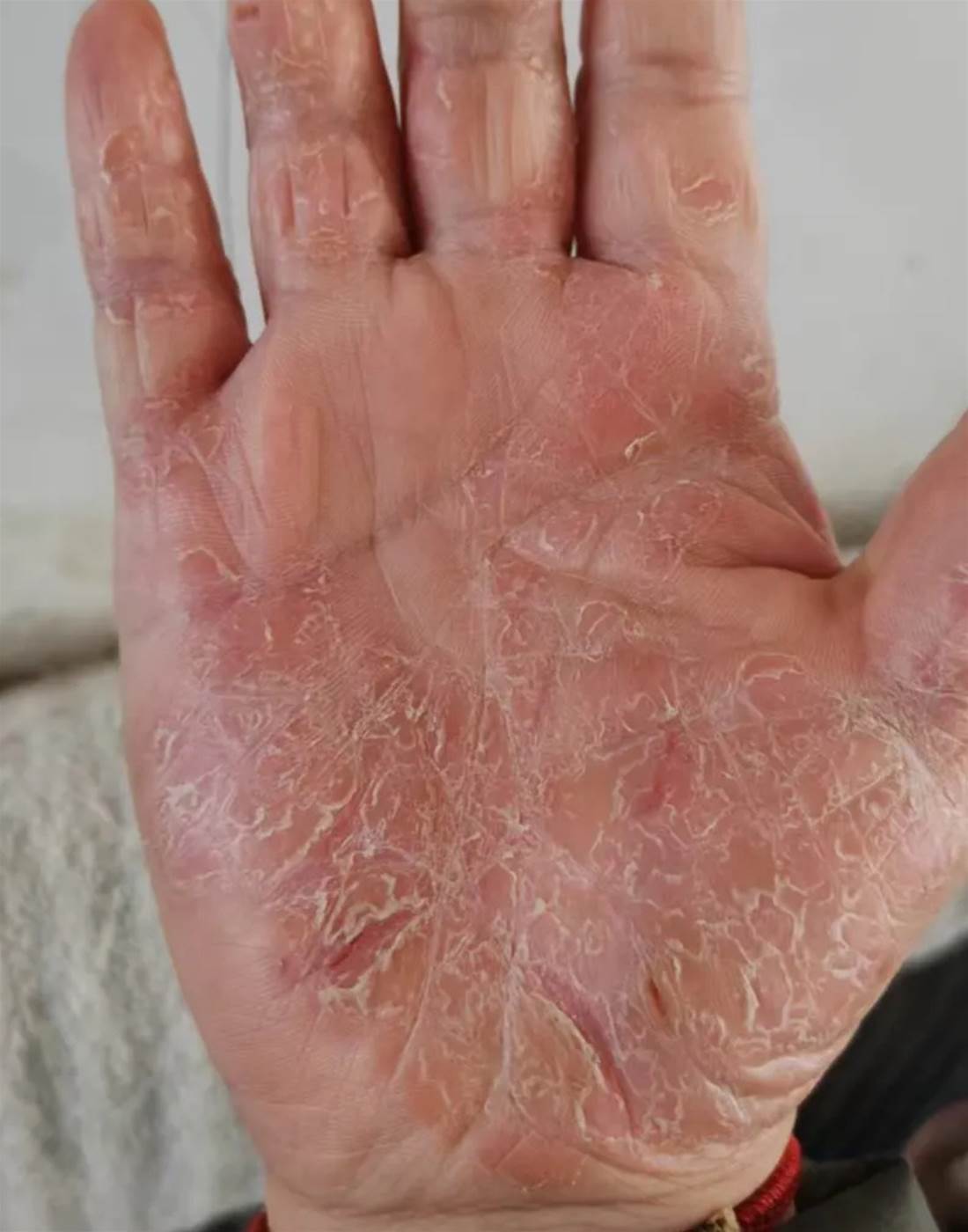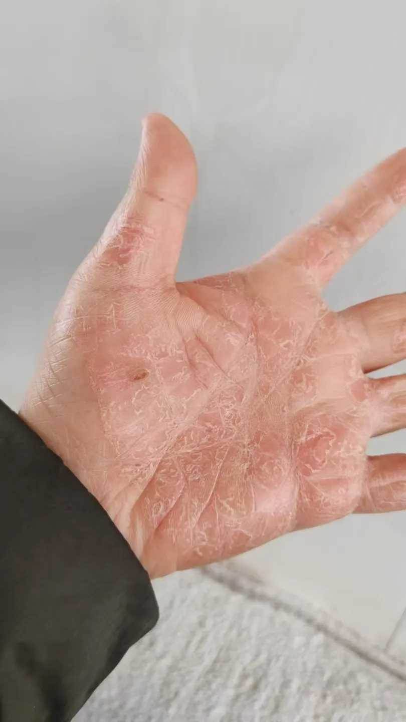 32歲的張女士(化名)在微博發文稱,丈夫李先生的手掌從三個月前開始出現紅腫、脫皮,起初以為是普通濕疹,便自行涂抹藥膏。然而,癥狀不僅沒有緩解,反而逐漸惡化——皮膚潰爛、滲液,甚至影響日常生活。