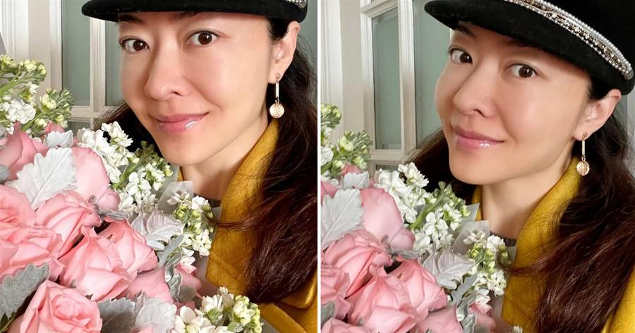 照片中,42歲的熊黛林,罕見素顏出鏡,她手捧著66朵玫瑰花,看起來十分的滿足而幸福。