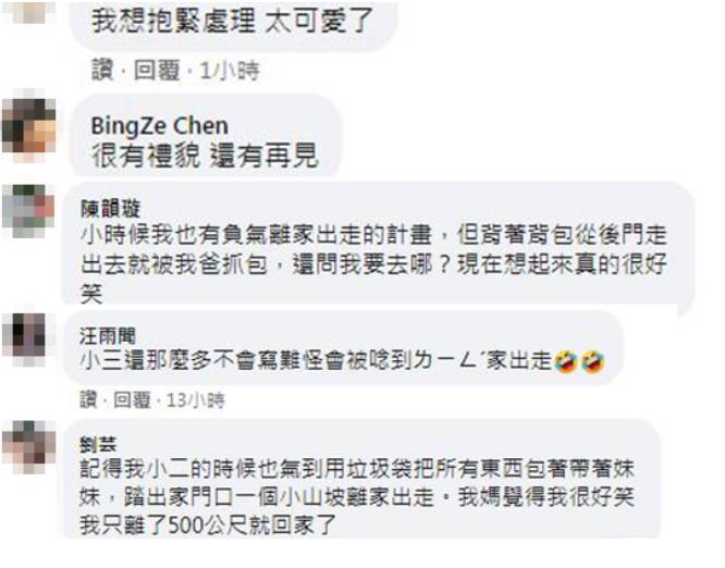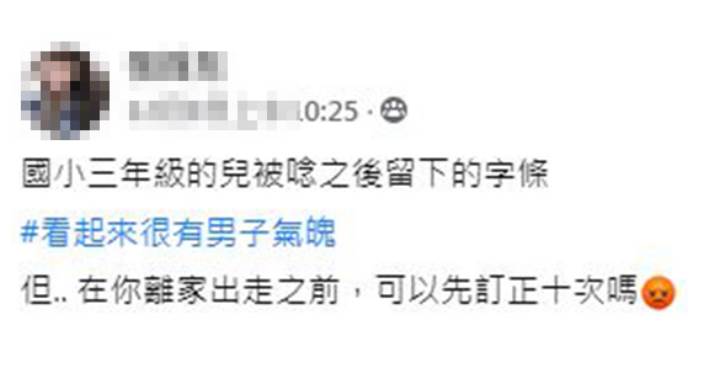 網友們看完字條,知道是國小三年級的孩子寫的之後,也通通哭笑不得。「小三應該會寫媽了吧?還是氣到忘記怎麼寫XD」、「先訂正再離家出走」、「拎家出走了,看來還知道要帶家當啊」、「三年級 這些字不是應該都寫國字了」、「他都森七七了,妳還這樣笑他」。