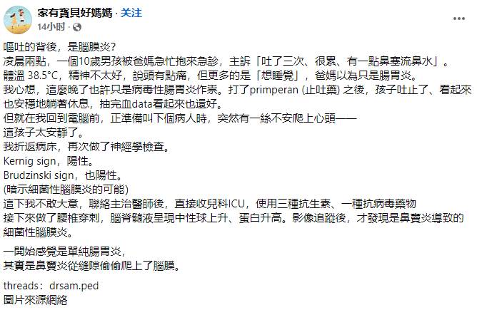 另一位護理師網友提醒,嬰幼兒腦膜炎癥狀更不明顯,可能只表現出嗜睡、食慾差,需要家長更加細心觀察。也有醫師網友補充,近年台灣肺炎鏈球菌疫苗接種率提升,已降低許多細菌性腦膜炎病例,但家長仍不能輕忽。