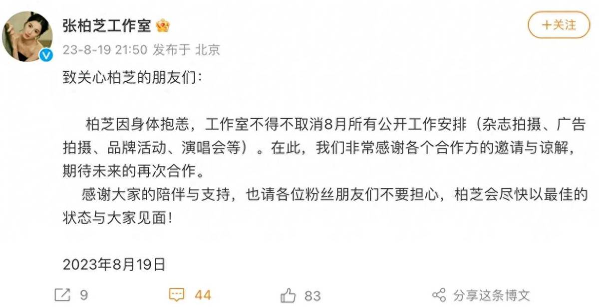 8月19日深夜,張柏芝最新近況曝光,令人沒有想到的是,這是因為張柏芝工作室在周末連夜緊急發文,表示取消張柏芝8月所有公開工作安排!不少網友看后,紛紛炸了鍋!工作室也不藏著掖著,正面回應了張柏芝停工的真實原因,表示:張柏芝身體抱恙!
