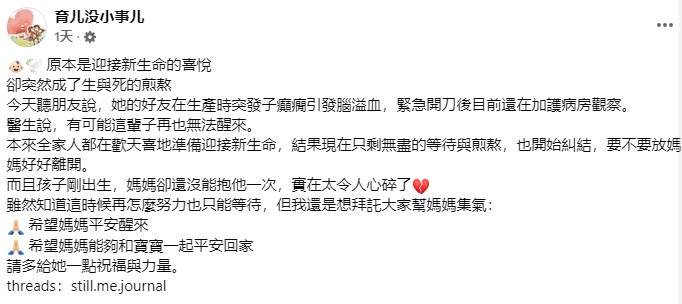近日一則令人心碎的貼文在網路引發關注,一名產婦在分娩過程中突發子癲前癥併發腦溢血,緊急手術後至今仍在加護病房與死神搏鬥。原本應該充滿喜悅的產房,瞬間變成生與死的煎熬戰場,家人們現在最期盼的,就是媽媽能夠醒來,親自抱一抱剛出生的孩子。