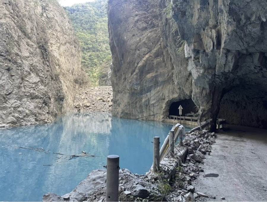 花蓮立霧溪河道17日因大規模邊坡崩塌形成堰塞湖,水位上升甚至淹至道路邊,雖然湖水呈現夢幻的「蒂芬妮藍」,但卻隱藏潰堤風險。