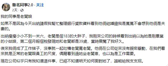 這名女員工在貼文中描述,出納同事看起來瘦瘦小小像剛畢業的大學生,老闆卻是183公分的大胖子,兩人外型差距極大。直到幫忙整理銀行貸款資料時看到結婚證書,才發現他們不僅都是39歲,還是結縭多年的夫妻。最讓她傻眼的是,全公司似乎只有她知道這個秘密,現在每天上班都要努力裝作若無其事。