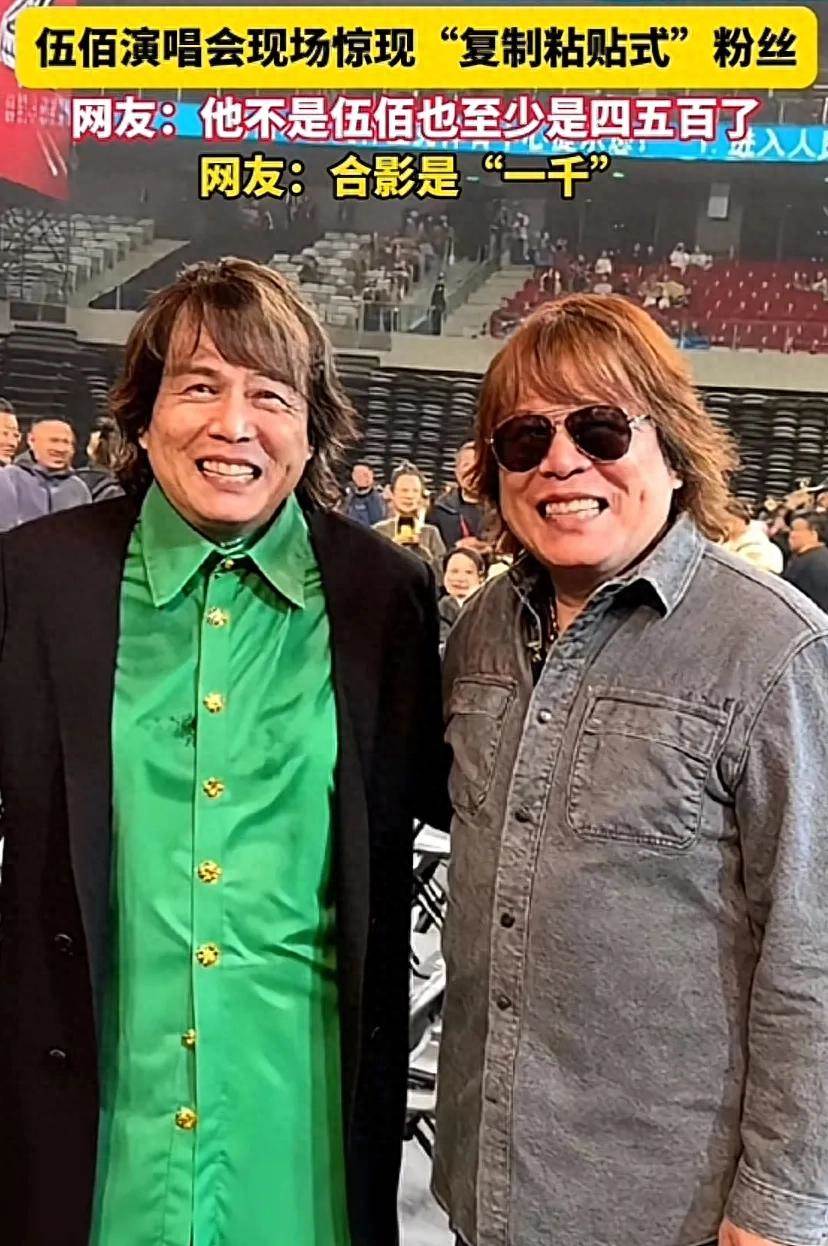 照片里,伍佰站在中間,穿著標志性的綠襯衫,笑容滿面地比著耶。旁邊那個粉絲,戴著墨鏡,長發披肩,穿灰色襯衫,氣質和伍佰有八分相似。兩人并肩站在看台前,背景是紅黃交織的燈光和興奮的觀眾,場面熱鬧得像過節。粉絲的造型不光像伍佰的打扮,連笑容和站姿都帶著幾分「伍氏風范」。網上有人調侃:「這是伍佰下凡,還是粉絲穿越了?」還有人說:「這哥們兒站在台上,估計都能假裝唱一首《浪人情歌》。」現場觀眾也起哄,有人舉著手機狂拍,有人喊「太像了」,氣氛被推到頂點。