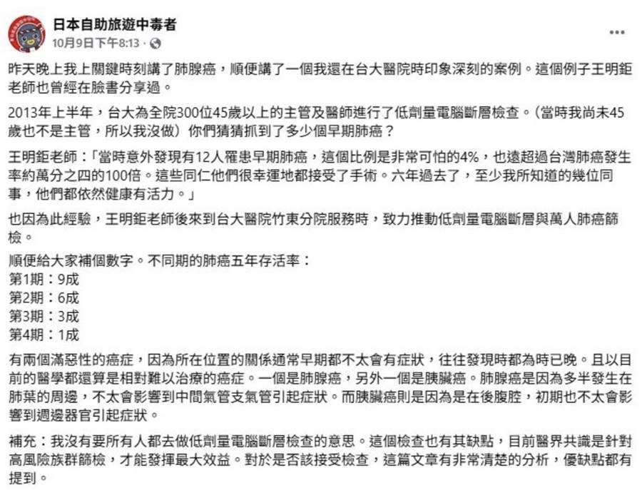 前台大感染科醫師「林氏璧」在粉專發文示警,2013年,台大醫院為全院300位45歲以上的主管和醫師進行了低劑量電腦斷層檢查,竟意外發現有12人罹患早期肺癌,占整體4%,也遠超過台灣肺癌發生率100倍。好在這些醫療人員接受手術後情況穩定,依然健康有活力。