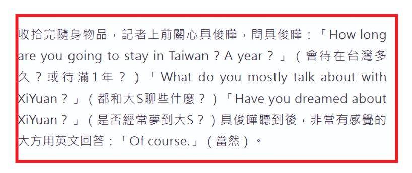 近日,又有台媒在金寶山遇到了他。這一次,具俊曄沒有躲避,也沒有匆匆離開,算是正式露面面對媒體了,當記者問道:「是否經常夢到大S?」具俊曄態度堅決回應:「Yes,of course。」