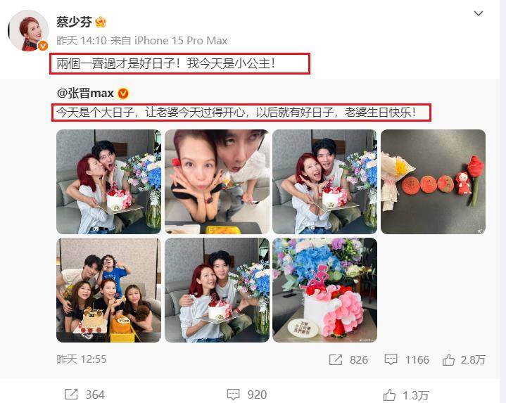 張晉發文稱:「今天是一個大日子,讓老婆今天過得開心,以后就有好日子,老婆生日快樂。」看得出,張晉平日里十分寵老婆。而很快蔡少芬也回應道:「兩個一起過才是好日子,我今天是小公主。
