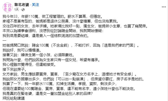近日一名33歲工程師在網路論壇發文,表示自己年薪110萬,卻在談婚論嫁時面臨女方家要求百萬聘金、買房登記女方名下、第一個孩子從母姓等條件,讓他自嘲像在簽「加盟合約」,貼文引發上萬網友熱議。如今事件出現驚人發展,該男子直接曬出與女方家的對話紀錄與自擬的「結婚合作意向書」,其中一個關鍵細節被眼尖網友發現,瞬間讓風向逆轉。