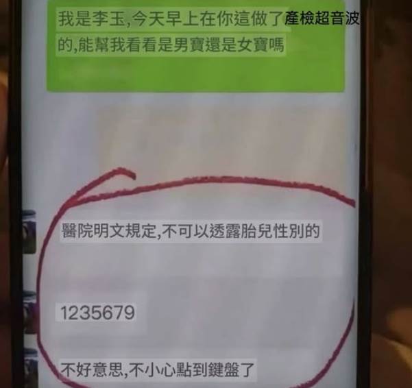 醫師則明確回覆:「醫院明文規定,不可以透露胎兒性別的。」然而,對話結束後,醫師卻突然傳來一串神秘的數字「1235679」,並補上一句:「不好意思,不小心點到鍵盤了。
