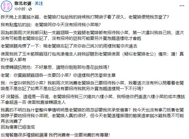 近日網路一則「買鹹水雞討招待被老闆嗆」的貼文在地方社團引發熱議,原PO表示因前兩次消費都獲贈小菜,第三次開口詢問卻遭老闆以「嘖」聲回應,雙方發生口角。這起消費糾紛在網路上持續延燒,當事老闆終于在今日現身回應,卻讓整起事件出現驚人轉折。