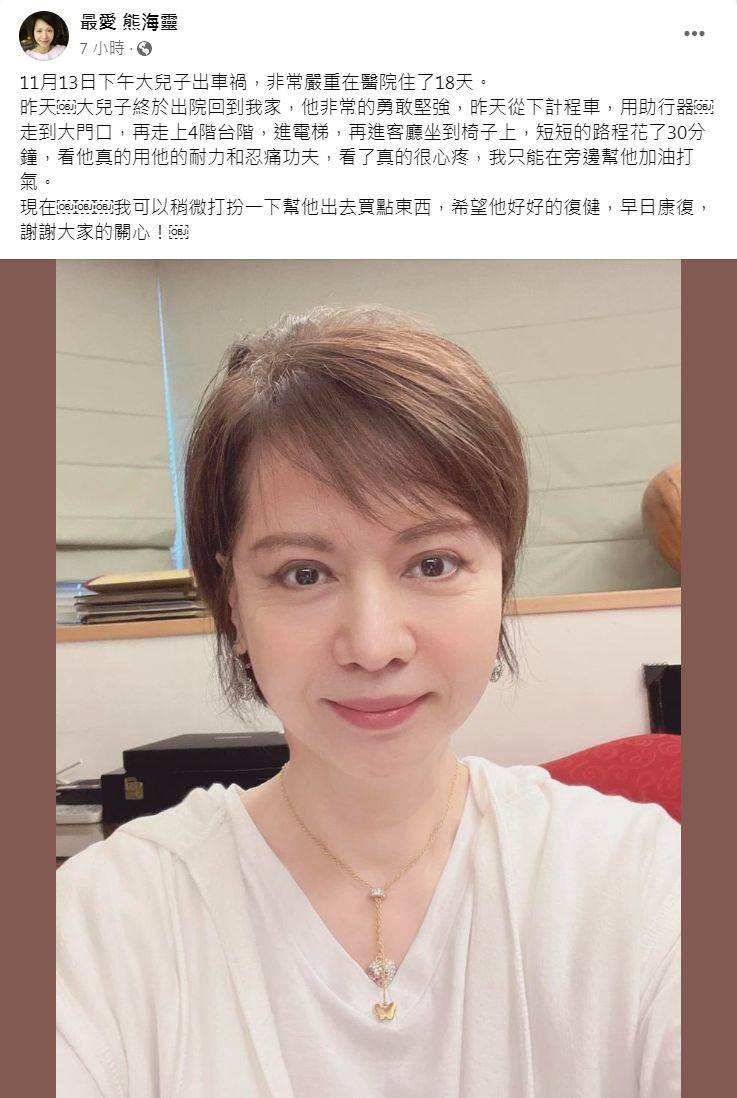 資深女星熊海靈出道多年,過去靠著一雙美腿走遍各大秀場、演藝節目,被封為「長腿姊姊」,她跟老公結婚後生下2個孩子,然而後來卻沒能繼續走下去,失婚後在2018年轉換跑道,然而近日她卻突然驚曝,大兒子出了很嚴重的交通事故,當時狀況也曝光了。