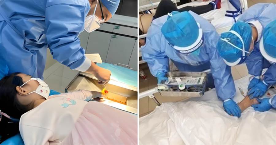 女孩臉色蒼白,眼淚不停從眼角滑落,右手手指傷勢嚴重,鮮血染紅了擔架床。護理師一邊輕聲安撫,一邊緊急壓住傷口止血,孩子微弱地喊著:「阿姨...我手指好痛...」