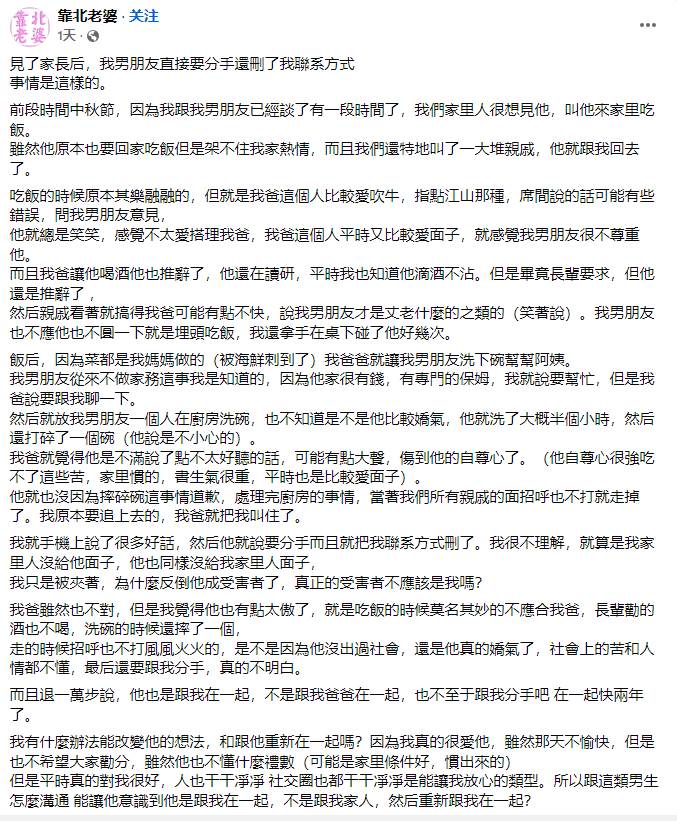 近日網路一則「見家長後被分手」的貼文引發熱議,女主角抱怨男友在中秋家宴上不喝酒、不應酬、打碎碗後不告而別。